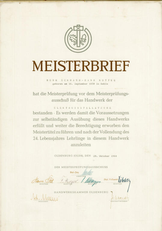 Meisterbrief. Von nun an nannte er seine Firma Elektro Kottke. Schwerpunkt: